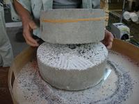 石臼は2つの石が金属製の心棒で接続されたもので、石と石がこすれる側にはすり鉢のような溝が切ってあります。上の石には穴が空いていて、そこにソバの実を落とし回転させると、石と石の間の溝ですりつぶされ、粉と殻になって石と石の隙間から外側に押し出されてきます。だいたい10粒落として3回転させると良い粉がひけるとか、手間と時間のかかる作業です。