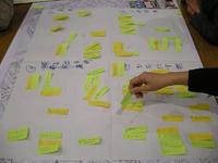 ◆模造紙を4分割し、設問(1)〜(4)の場所を作る。各人の行動等が書かれた付箋を分類しながら貼り付けていく。同じ内容のもは重ねる、○で囲む等、グループ内で話し合いながら解りやすくまとめていく。