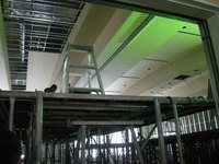 天井には講堂を分割する可動式壁のレールも設置されたいました。そこを閉めると1/3と2/3に分割できるのですが、2/3部分はほどよい広さで使い勝手の良いスペースになりそうです。それに対し1/3は思いのほか狭く、ウナギの寝床状態。大きく一面を使うか、分割して使うか・・・完成後の使用形態についても要観察です。