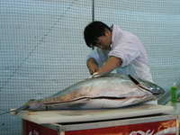 そして、今回の目玉は「マグロの解体ショー」。午前と午後の2回、それぞれ1体のマグロ(約30kg/体)を、Aコープのお魚屋さんが解体していきます。普段、買い物で見慣れていた魚屋のお兄さんの手際の良い包丁さばき、重たそうなマグロ、マグロの匂い、きれいな切り身・・・マグロステージの前はいつの間にか黒山の人だかりとなり、近づいては覗いたり、声をかけたり。身近なお祭りだからこその光景を目にしました。