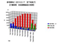 ■介護保険会計:施設介護給付費が増えている(介護施設を利用する人が急増している)ことから、歳出が高止まり、もしくは増える傾向にある。介護保険料は3年に1度の改定(平成21〜23年は同額)のため保険料収入増は見込めない。