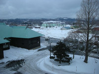 写真は役場3階の議員控え室からの風景。日中の気温がプラスになる日も増え、雪が随分ゆるんできました。今日の最高気温は+4.3℃、最低気温はー1.0℃、多少の日差しもあり、ここ1週間のうちでは一番暖かな日でした。(写真では暗い雲がたれ込めて寒そうですが、暖かな日だからこそ雪雲の白でなく、雨の黒雲になります。)