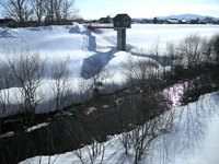 土手の雪は春の日差しに引き締まり、ウサギが飛び跳ねた跡を際立たせています。川縁の柳は冬芽が大きく膨らみ枝先をほんのり茶色に煙らせ、ところどころネコヤナギ状態になっています。