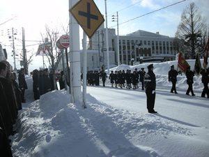 続いて分列行進。月形支署前を出発し役場前を通って交流センターまで、消防団本部(女性団員を含む)を先頭に第1分団、第2分団、消防関係車両(消防団配備のポンプ車や消防支署の広報車、工作車、救急車等)の順に隊列を作り、勇ましいラッパの音とともに行進します(写真)。