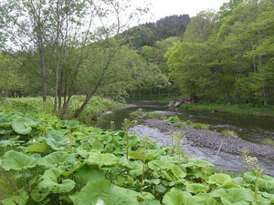 ※写真は西興部村の興部川(おこっぺがわ)河畔。オホーツク海に近く寒さが残る地域で、この時の気温は3.6℃(街の温度計)。浅い新緑がとても綺麗でした。