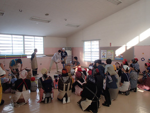 園舎の中央、講堂の端には2つの臼が据えられ、お手伝いのお父さん数名とおばあちゃんがお二人、餅をつき始めていました。子ども達はキラキラした眼でそれを眺め、時には身体をくねらせ、時には声を出して、餅がつき上がるのを心待ちにしていました。