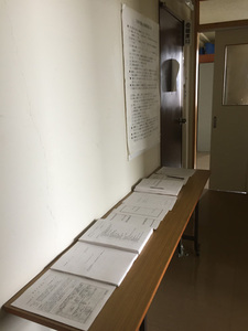 2枚目:傍聴席入口手前の廊下。傍聴資料(議事日程、各種報告書、議案書、町政執行方針、教育行政執行方針)と傍聴受付用紙(一覧表に住所と氏名を記入する)