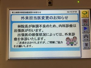 2月13日以降、IP告知端末で「院長体調不良のため、内科診療は出張医が行います。出張医の確保状況によっては外来診療を休診いたします」と流れるようになってからは一層多くの声が寄せられるようになり・・・